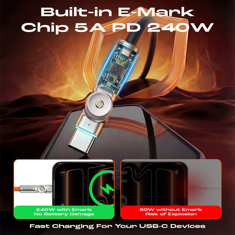 The integrated E-Marker chip enables accurate current identification up to 5A, ensuring safe and efficient 240W power delivery. Intelligent power management protects connected devices and maintains charging stability under high loads.