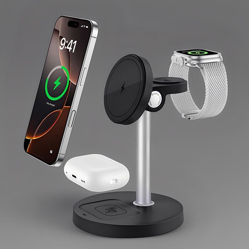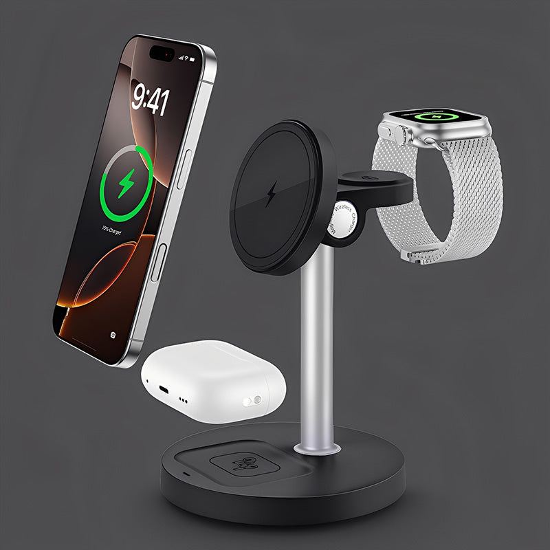 Seamlessly charge your iPhone, Apple Watch, and AirPods with this 3-in-1 MagSafe station, offering magnetic precision and fast wireless efficiency.