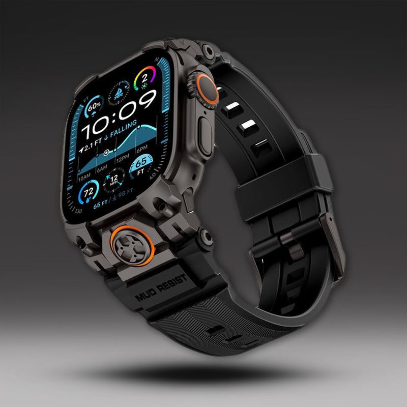A bold, skeletal frame extends from the band over the watch screen, offering radical visual transformation and 360° protection. It features a soft inner liner, raised edges to guard against impacts, and a secure, gap-free fit.